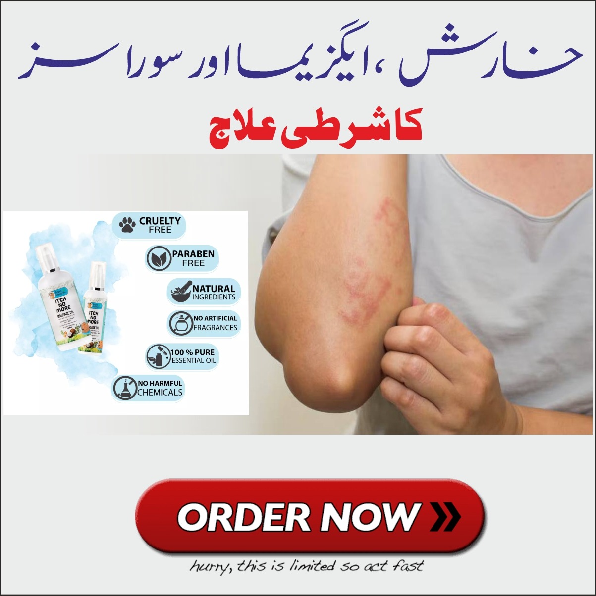 یہ آئل قدرتی، ہلکا اور ہر عمر کے افراد کے لیے موزوں ہے۔ خارش، الرجی، ایگزیما، اور جلد کی حساسیت سے نجات کے لیے لش اِچنگ آئل آزمائیں!